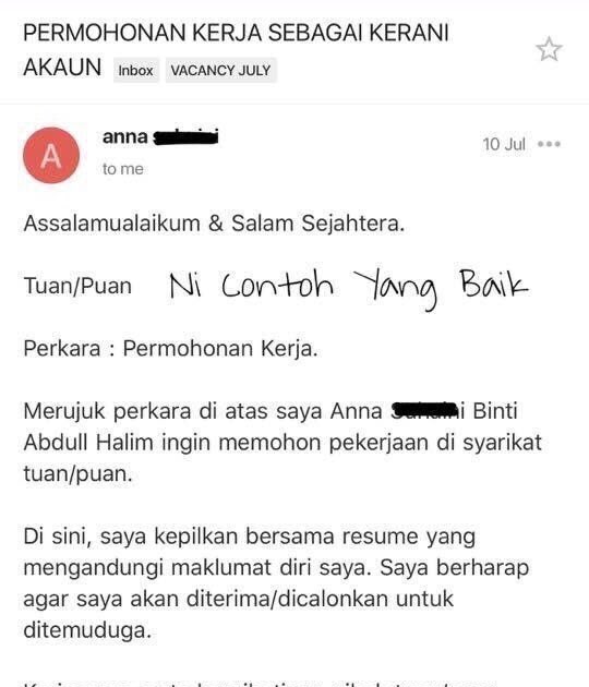 Perkara pertama yang biasa kita lakukan untuk memohon kerja adalah menghantar resume melalui email kepada syarikat yang dikehendaki. Boleh ambik contoh2 emel kt bawah ni as reference. Kami ada menerima pelawat yang bertanyakan contoh email mohon kerja. Mohon, pelajari isi kontrak tersebut supaya ke depannya tidak terjadi. 8 contoh email memohon kerja, jangan biarkan email kosong. Teknologi kini yang semakin maju membolehkan kita untuk memohon kerja secara atas talian sahaja. Pelamar kerja haruslah mengetahui cara membuat dan contoh body email lamaran kerja. Netizen ini berkongsi 2 contoh email. Berikut adalah contoh cover letter terbaik dalam bahasa melayu yang boleh dijadikan sebagai rujukan dan panduan. Panduan menulis resume kerja yang memikat majikan. On aug 21, 2020 last updated aug 21, 2020. Surat lamaran kerja melalui email saat ini banyak digunakan oleh para pelamar kerja. Email yang kosong akan memberi tanggapan yang tidak bagus kepada majikan.